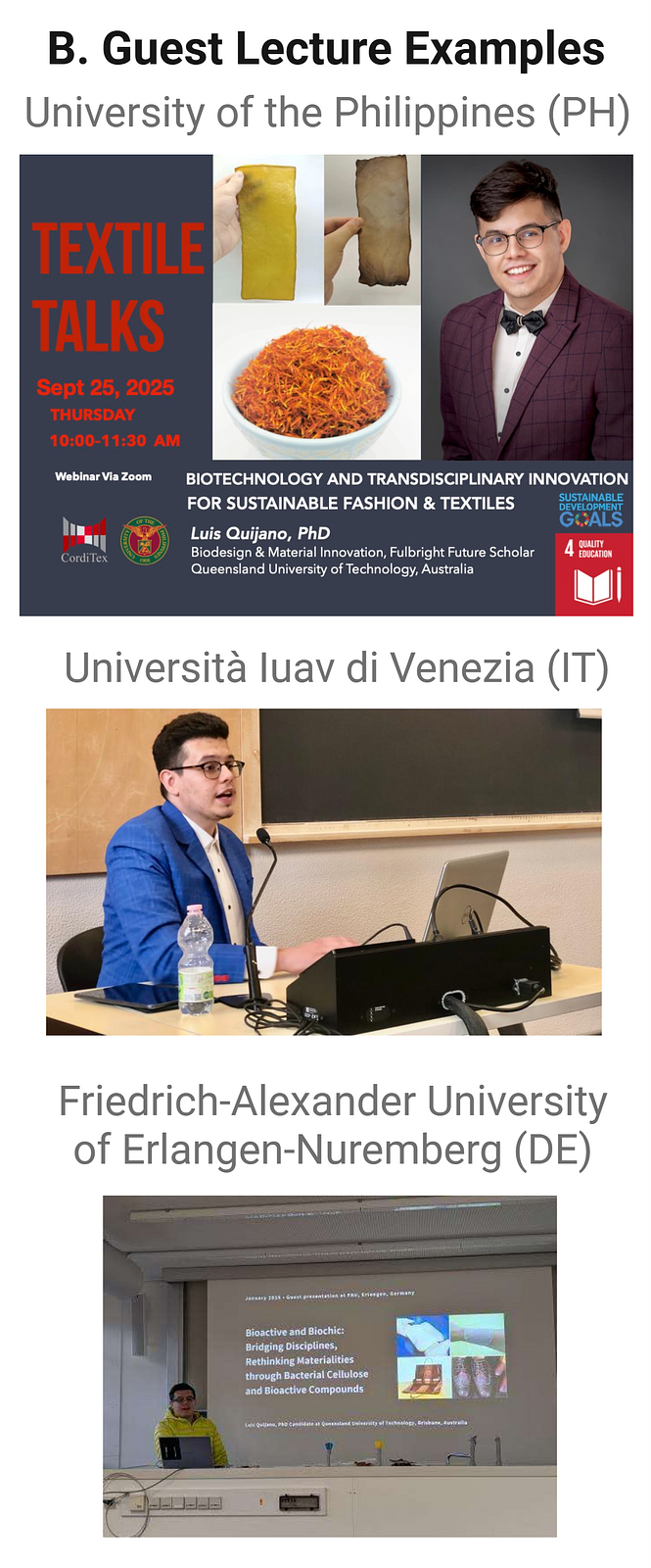 Between 2018 – 2020, I was an English as a Second Language (ESL) Teacher for 2 years in China and Thailand. In 2018–2019, I taught primary school students at Qilin Primary School in Shenzhen, China grades three to five. Class sizes were 40-50 students once a week to fifteen different classes. In the summer of 2019, I taught English to university students at Taiyuan University of Technology, in an intensive course that was from 8am to 5pm. In 2019–2020, I taught Korean adults seeking to practice their conversational English with Pagoda SCS through online software. These teaching experiences ranging from keeping a room full of energetic third graders engaged with English basics in Shenzhen to motivating university students during long, intensive summer days, have helped me develop strong classroom management and creative communication skills. I am excited to bring that same enthusiasm, adaptability, and encouragement into the college classroom. Directly related to fashion and textiles, I have given more than 30+ guest lectures or invited presentations to more than 1650+ people around the world.