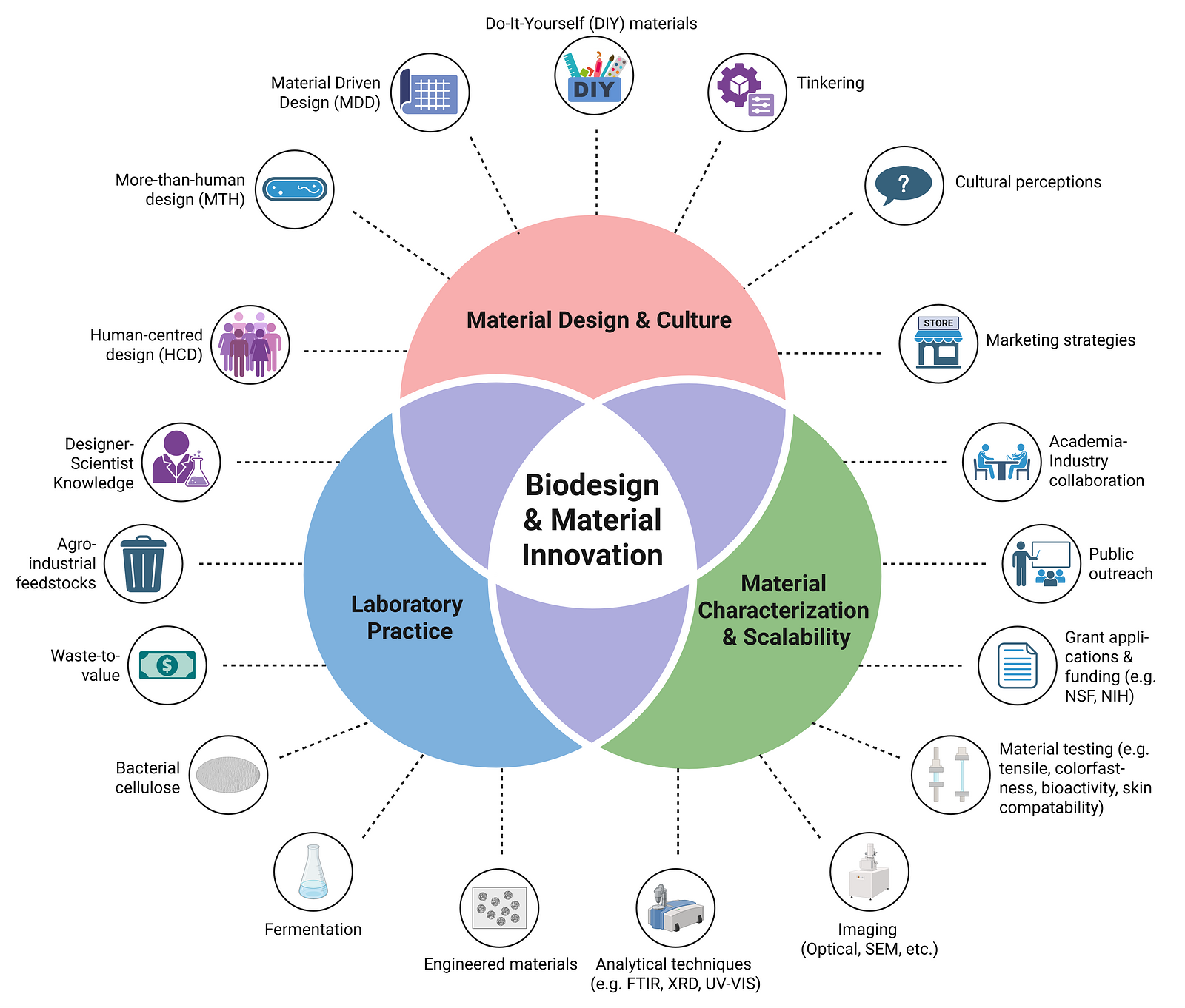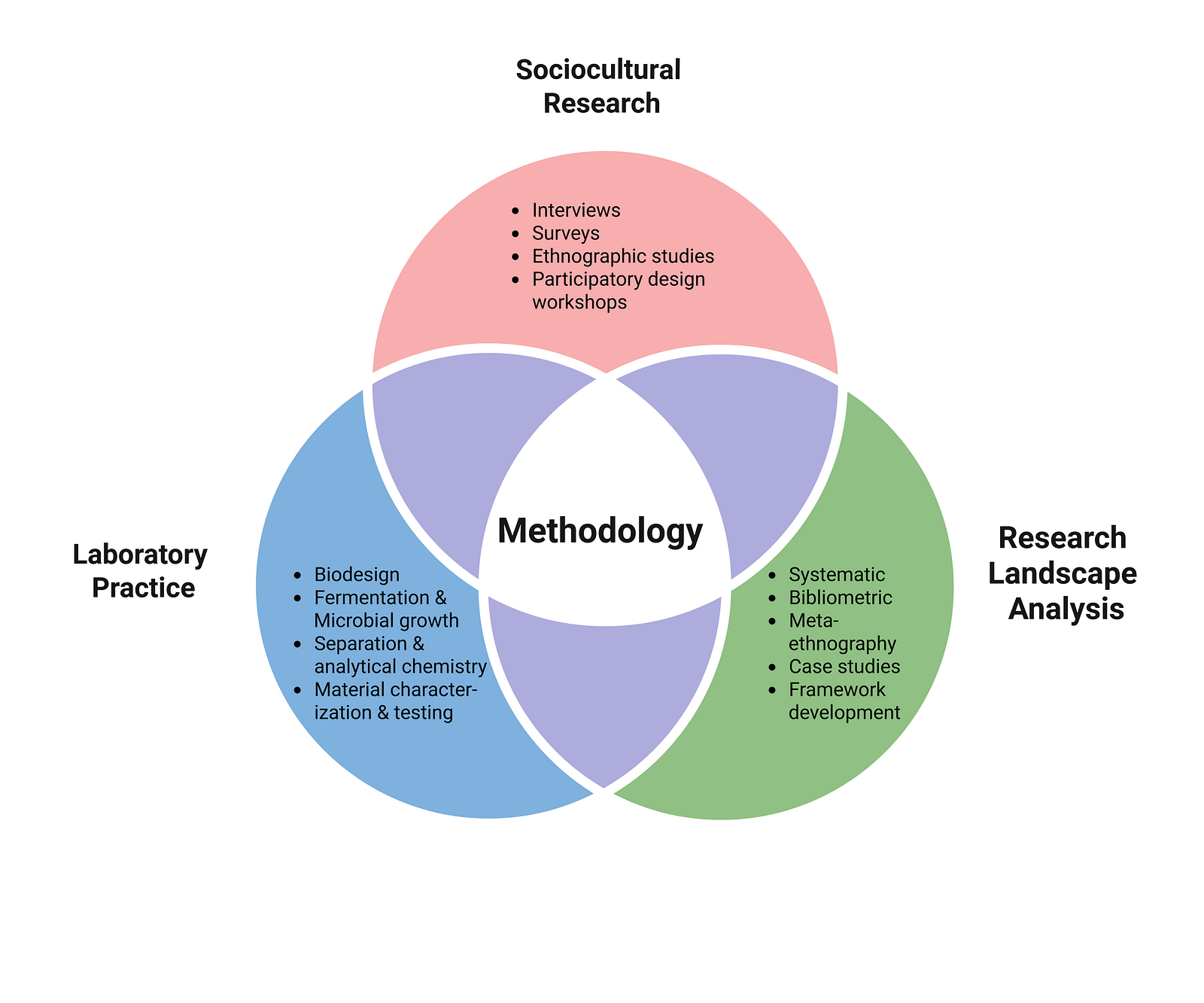 To do so, I leverage mixed-methods and data sources including (a) laboratory practice (design: biodesign; biology: fermentation, microbial growth; chemistry: separation and analytical chemistry; material science: characterization and testing), (b) sociocultural research (semi-structured interviews, surveys, autoethnography, participatory design workshops) and (c) research landscape methods (systematic/bibliometric reviews, meta-ethnography).